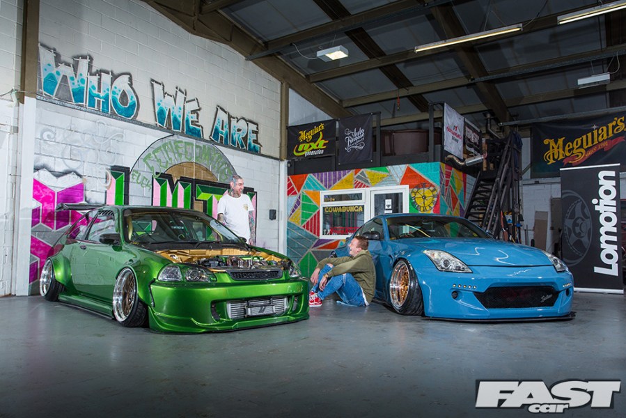 On the other side of the garage we have Scott Lennon and his bonkers 350z. Scott is also no stranger as we previously featured his smooth, super-clean Civic. This time, he’s ditched the subtle and gone for maximum impact with a mighty-phat Z that pushes the boundaries.