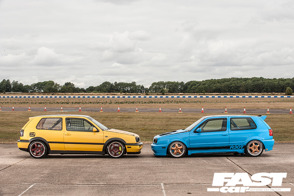These two immovable forces push against each other like the matched poles of twin magnets, and we find this mirrored in the two cartoonish Mk3 Golfs you see here. In the Marvel corner, we observe Sol Peer’s Porsche-blue car – just look at his headlining and doorcards to see where his allegiance lies. And fighting the DC corner is Rae Gami, his Lamborghini-yellow Golf’s headlining proudly flying the DC Comics flag. When two irrepressible energies such as these meet, you’d do well to stand back, lest you be pummelled with shrapnel or simply vaporised where you stand. The fact that these cars are running a combined 1,200bhp should be enough to convince you to exercise caution… although as we tentatively approach the owners waving our well-worn white flag, a ripple in the Matrix glitches across our midst. These two fellas aren’t mortal enemies. They’re good mates, united in enthusiasm for ridiculously powerful retro Volkswagens, and there’s little to be afraid of here. We sheepishly trouser the flag and start asking a few searching questions, more than a little disarmed by their broad smiles.