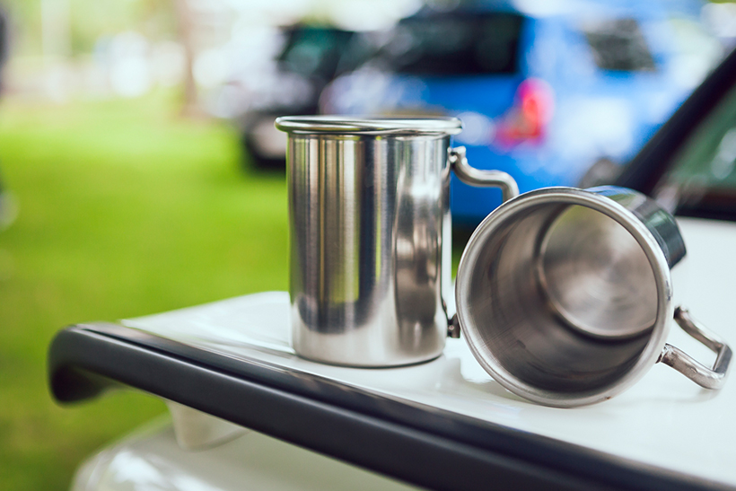 Well, if you’re looking for something super-sick for slurping your cup of Rosie Lee outta, we can’t think of anything better than these exhaust-inspired stainless steel mugs. Two sugars please!