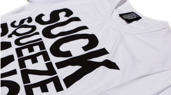 These fantastic ‘Suck Squeeze Bang Smoke’ tees are available in small, medium and large and come in white or electric blue with NSNP sleeve tabs.