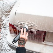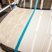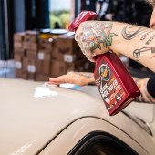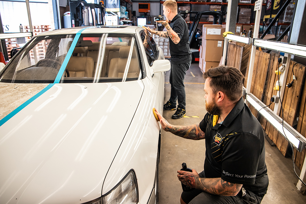 With the washing process complete, correction is the next stage. While the car has been thoroughly washed, there are still bonded contaminants on the paint’s surface, and the next tool in the arsenal is the Meguiar’s Clay Kit. This is a technique which some people find daunting, but it really isn’t: with a squidge of Quik Detailer on the surface, all it takes is fingertip-pressure on the clay bar to lift that crud right off. Why do it? Quite simply that polishing over these contaminants will grind them back into the paint, causing further damage such as swirls and scratches. And what about the swirls and scratches that the Lexus already has from years of inattentive detailing by former keepers? Ah, fear not, for the guys have a solution for this too. Ultimate Compound is the answer – it has built-in paint cleaners as well as abrasives, so the former lifts out the ingrained dirt while the latter eases out the swirls to a uniform smoothness. The Ultimate Compound is applied with a hand-held machine polisher, gently massaging the body back to its former glory. The Lexus took a few passes with the compound to get it tip-top, but the polishing discs are machine washable and they can just go in the laundry, it’s all far more stress-free than you