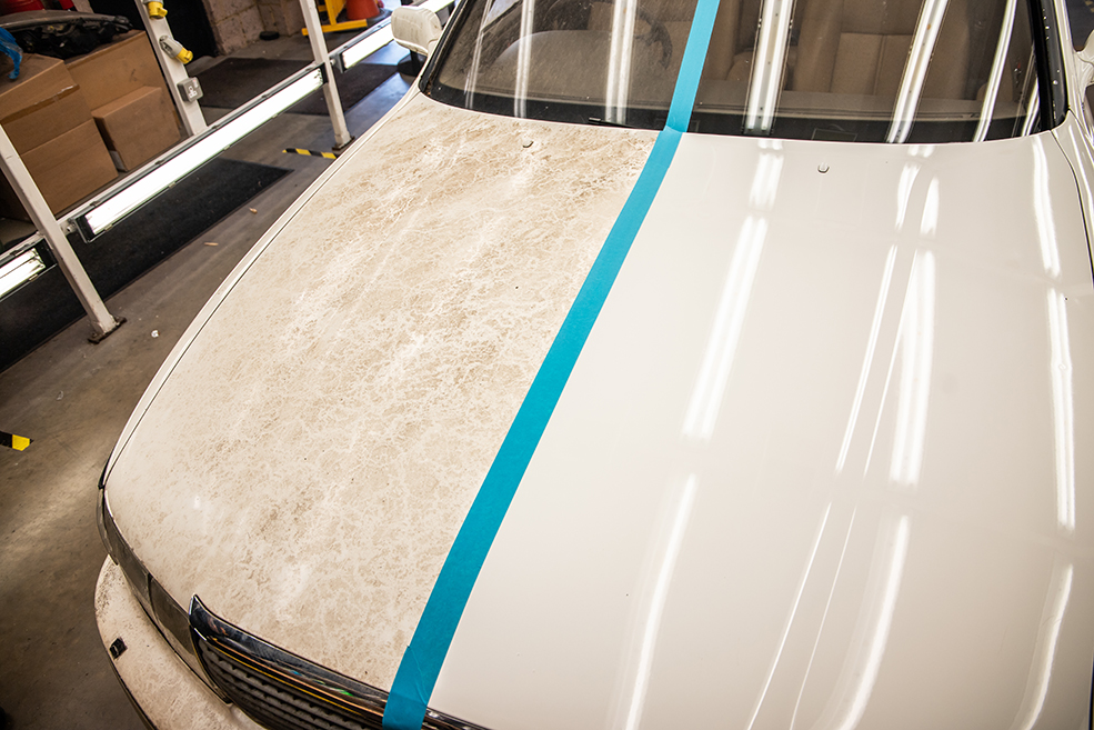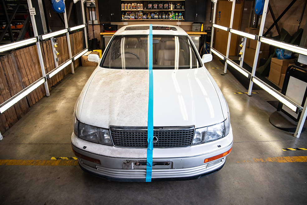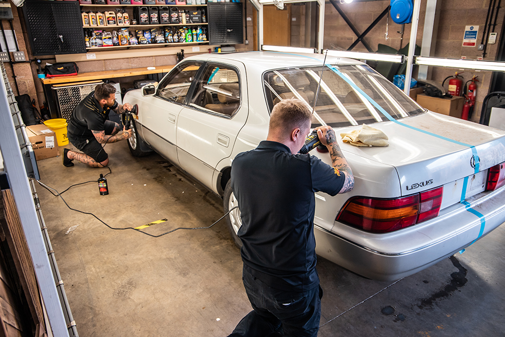 So, on to stage four: polishing. With the paint revitalised, now it’s time to refine it, which means cracking out the Ultimate Polish. This will really enhance the gloss and give it a proper shine; again, it’s a case of squirting it onto a disc on the machine polisher and massaging it across the surfaces. The polish is quick to do its job, and before you know it the LS400 is looking like a totally different car.