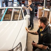Day two, and we find the boys raring to go with the Ultimate Detailer, to safely lift away any dust that may have gathered on the surface overnight. This stuff boosts gloss and protects, as well as removing contaminants between washes, so it’s a handy thing to have in your kit bag. With that taken care of, it’s time to address some other key areas. There’s more to a car than paintwork, so now that this has been perfected there are other surfaces to tackle.