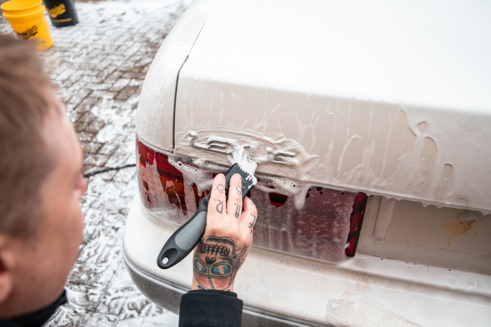 As the assorted cleaning potions are swished away, it’s immediately obvious that the work is already making a massive difference. The lustre of the paint is beginning to gleam once more, and the handles, badges, lights and windows sit cleanly in their recesses instead of looking like they might give you Ebola. And with the surface nasties eradicated, it’s time for the contact wash.