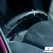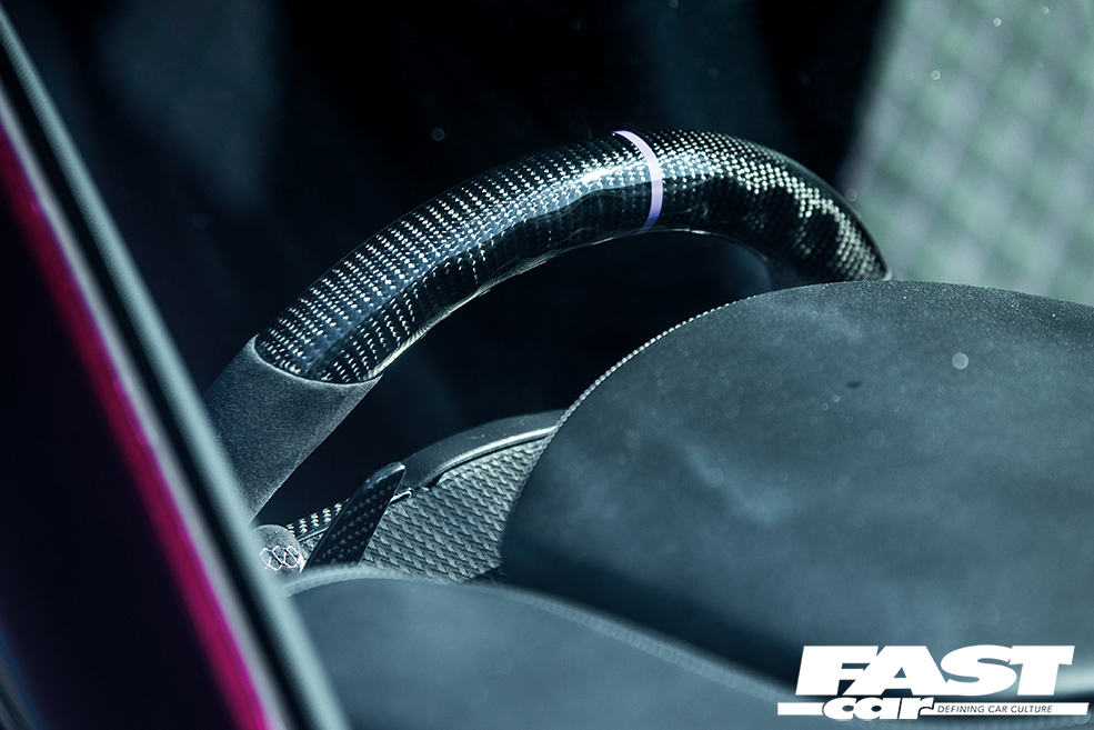 Recaro seats retrimmed in Alcantara Seatskinz with purple stitching, carbon steering wheel, carbon shift paddles, carbon interior panels