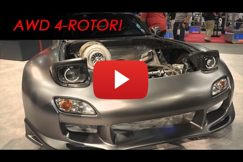 Full Boost take a look at Rob Dahm’s crazy turbocharged 4-rotor FD Mazda RX-7 on the Garrett stand at SEMA.
